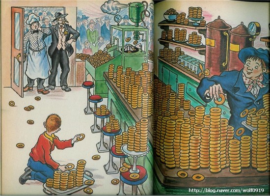 가장 기억에 남는 이야기는 단연코 "도우넛 소동"일 터인데, 참 뭐든 배가 고프고 힘들던 시절, 그림책에서나마 기계가 자동으로 만들어내는 "도나스", 그것도 기계 고장으로 가게 전체를 뒤덮을 정도의 도우넛이 쏟아져 나오는 장면은 큰 놀라움을 주었으며 풍요로운 미국에 대한 환상을 한껏 부풀게 해주었다.