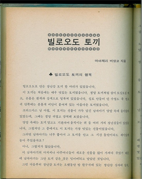 정말 미국적이라고밖에는 생각이 들지 않았던, 누가 실을 더 많이 모았는가에 대한 내기 장면 이 책에는 <빌로오도 토끼(The Velveteen Rabbit, 1922>가 합본되어 있다. 영국계 미국 작가 마저리 윌리엄스 비앙코(Margery Williams Bianco, 1881.7.22-1944.9.4)의 작품으로 맥클로스키와는 다르게 좀 더 진지한 시각으로 아이들의 심리를 들여다 보며 인상 깊은 작품들을 남겼다. 이 <빌로오도 토끼>는 <사랑받는 날에는 진짜가 되는거야> 같은 제목으로 여러 번 한국에 정식으로 소개가 되었다. 여기에 인터넷에서 찾은 내용을 첨언한다.